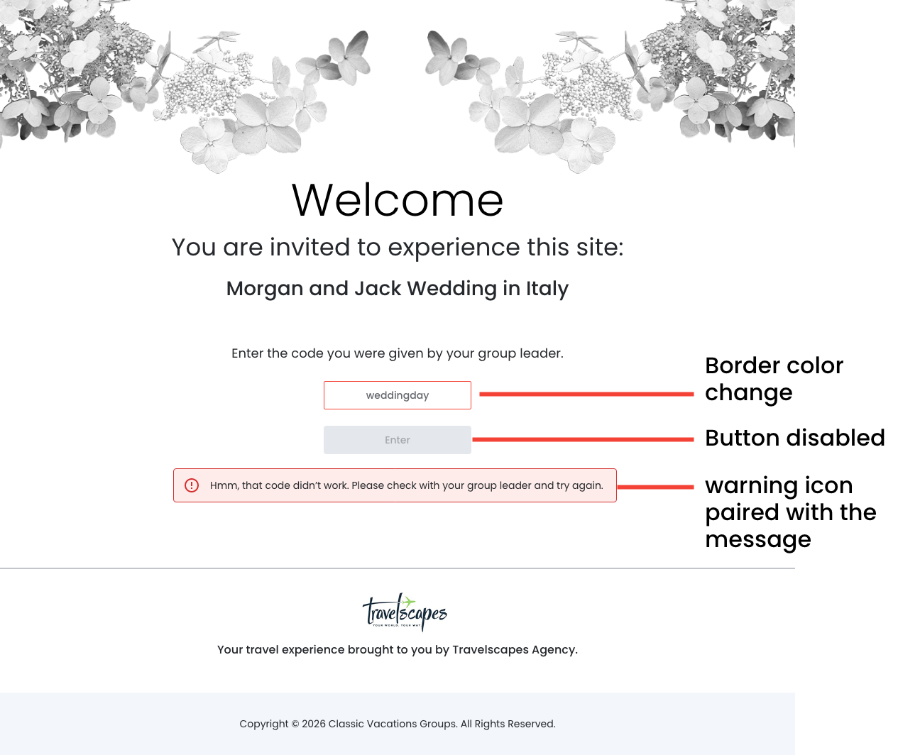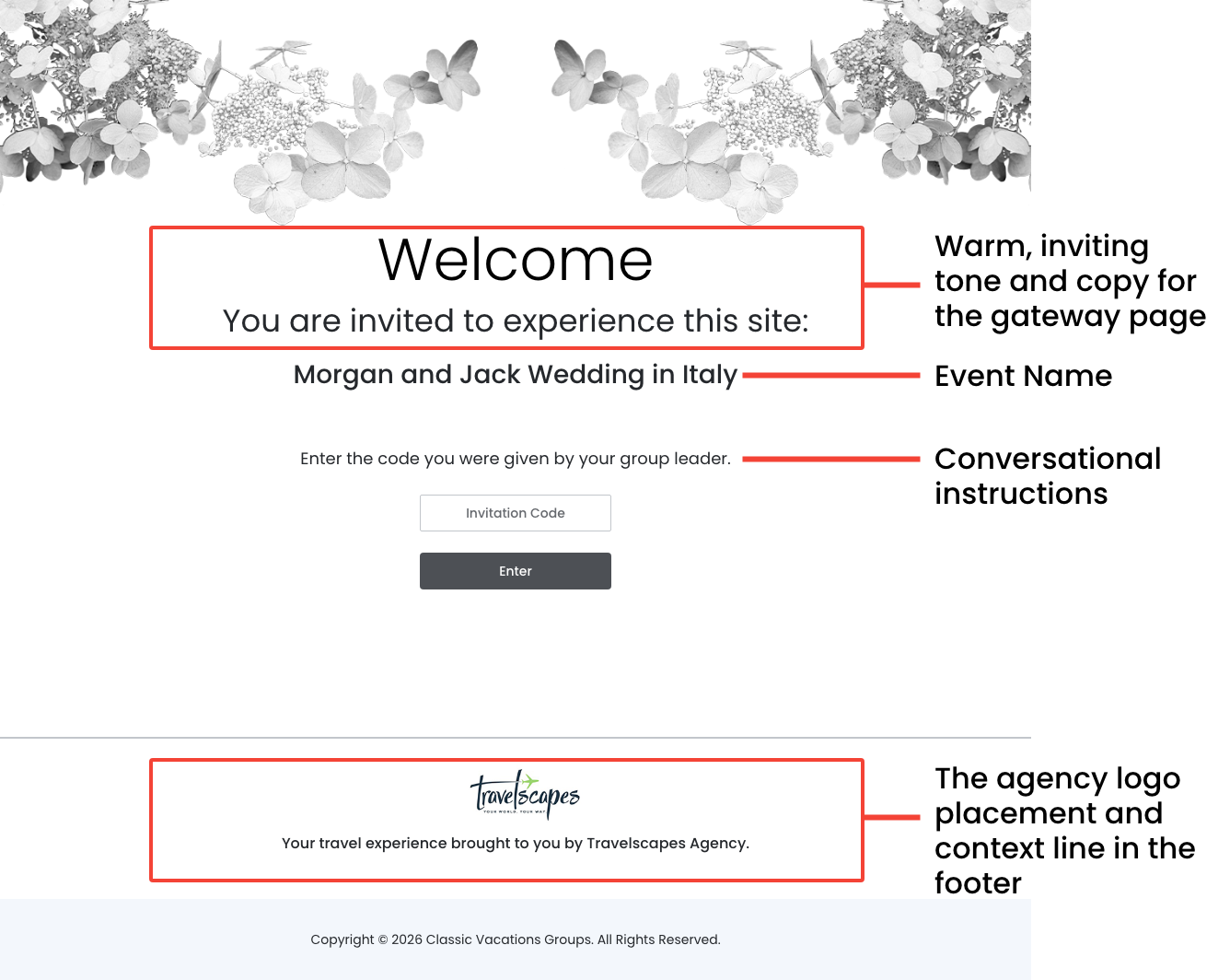 This is where the Invitation Code page lives. Its only job is to verify the guest belongs there and let them through. Nothing else should compete for attention on the page.