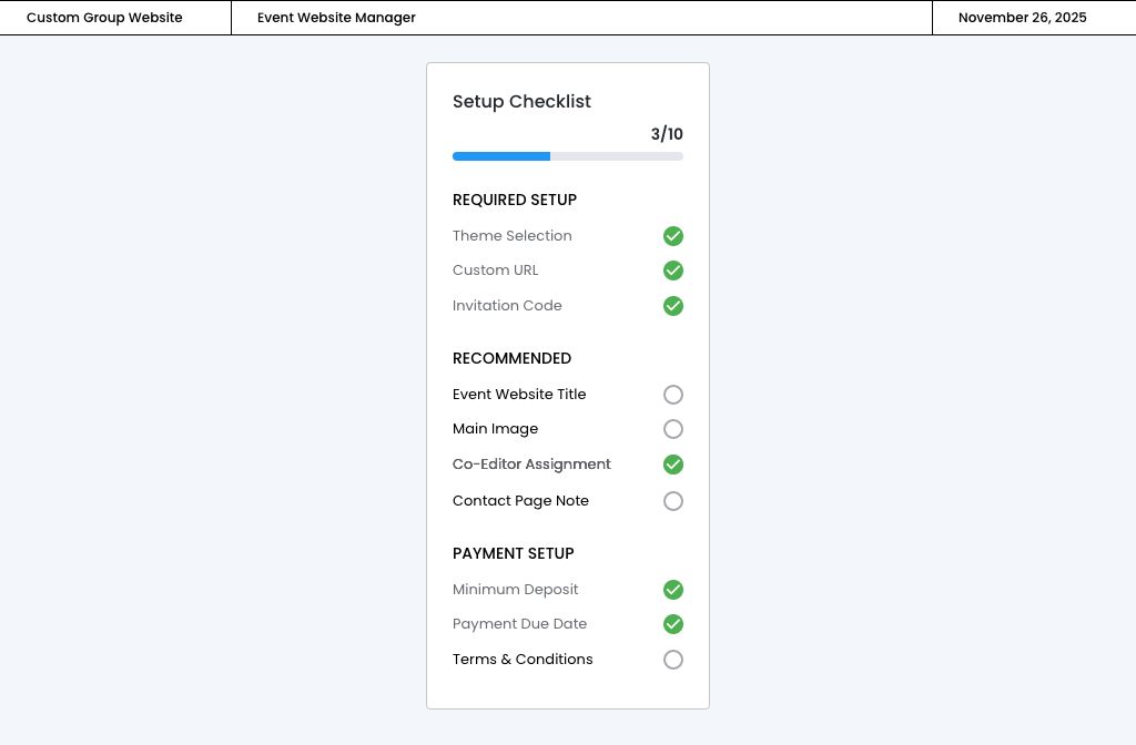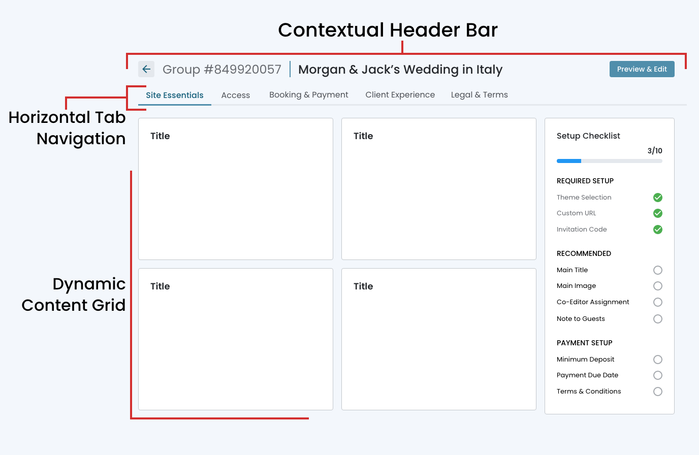 The Event Website Manager uses a structured dashboard layout that prioritizes progressive task completion while maintaining constant access to key actions and context. This architecture balances three essential elements: contextual navigation, actionable content, and progress tracking.