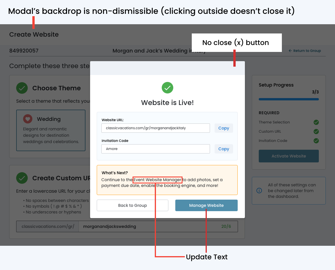 Creates a sense of accomplishment while providing clear direction for what comes next. Balances celebration with practicality, giving users immediate access to the key information they need to share their website.
