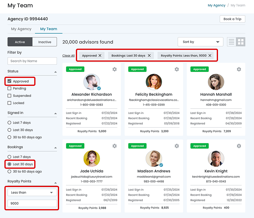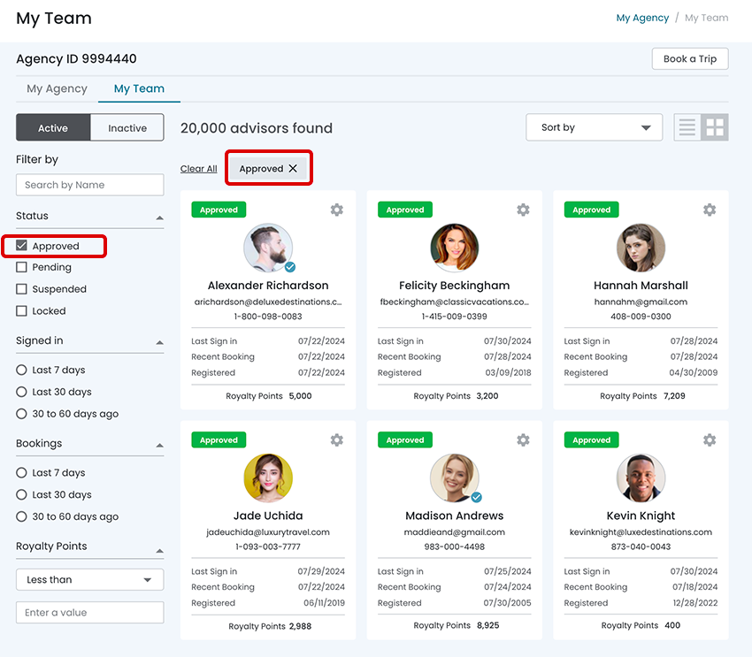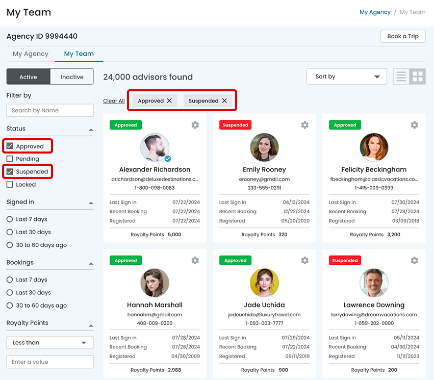 User can select Status, Signed in, Bookings, or/and Royalty Points in the side bar filter. A filter pill will display at the top of the grid.