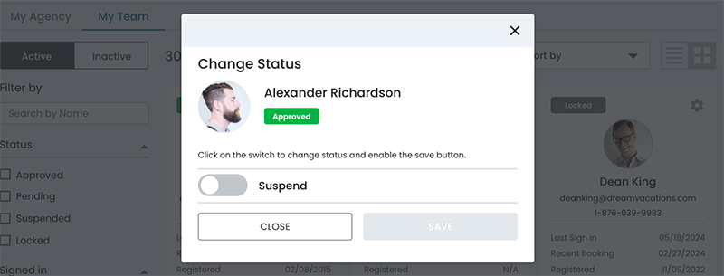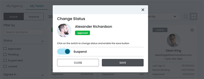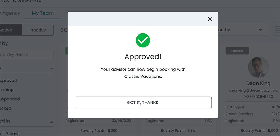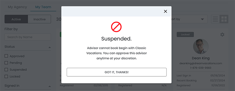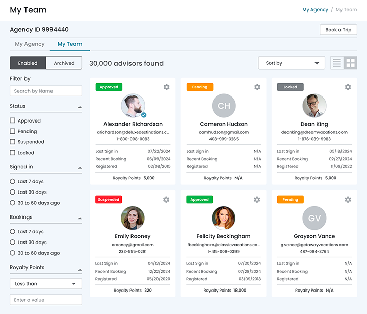 The UI will provide a view of all the advisors, categorized into approved, pending, suspended and locked members. This will help the user quickly assess the current status of the agency.