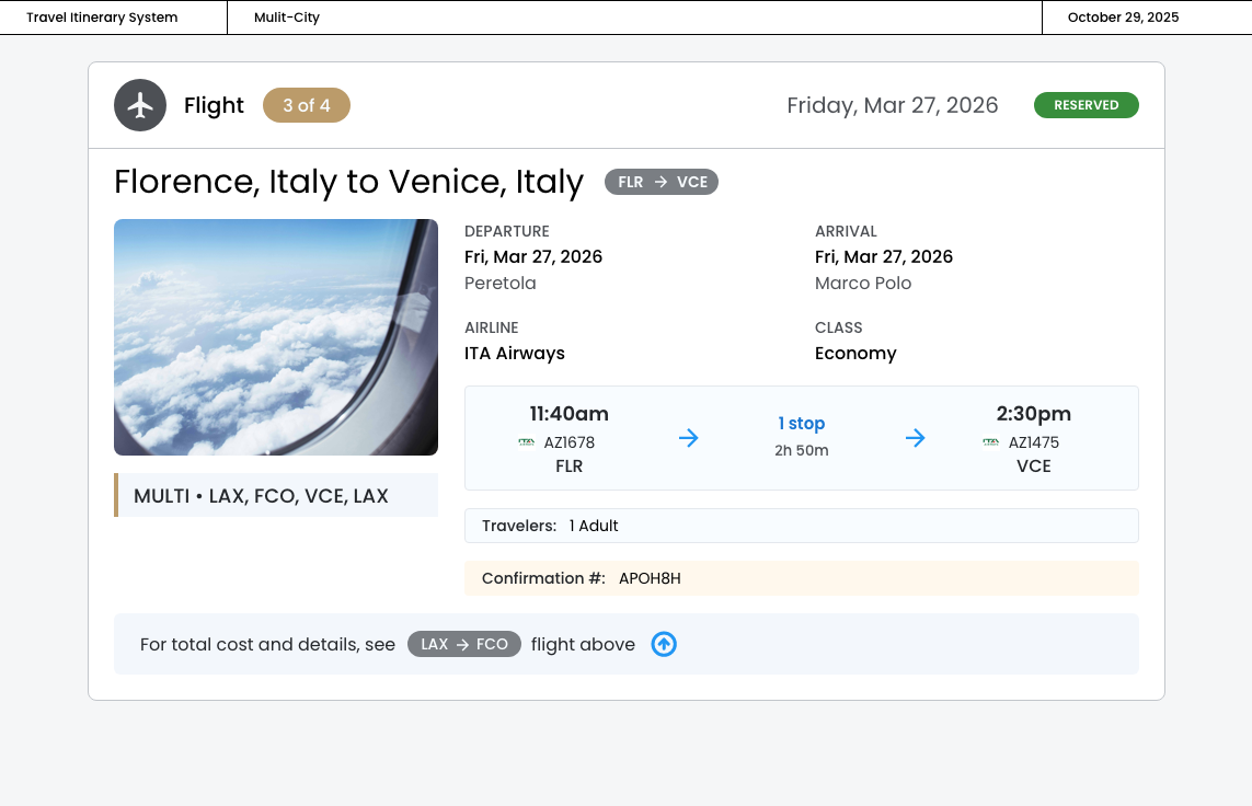 The "MULTI • LAX, FCO, VCE, LAX" indicator provides a quick overview of all destinations that creates a clear semantic relationship between separated cards, ensuring users understand these flights are part of a multi‐city booking.
