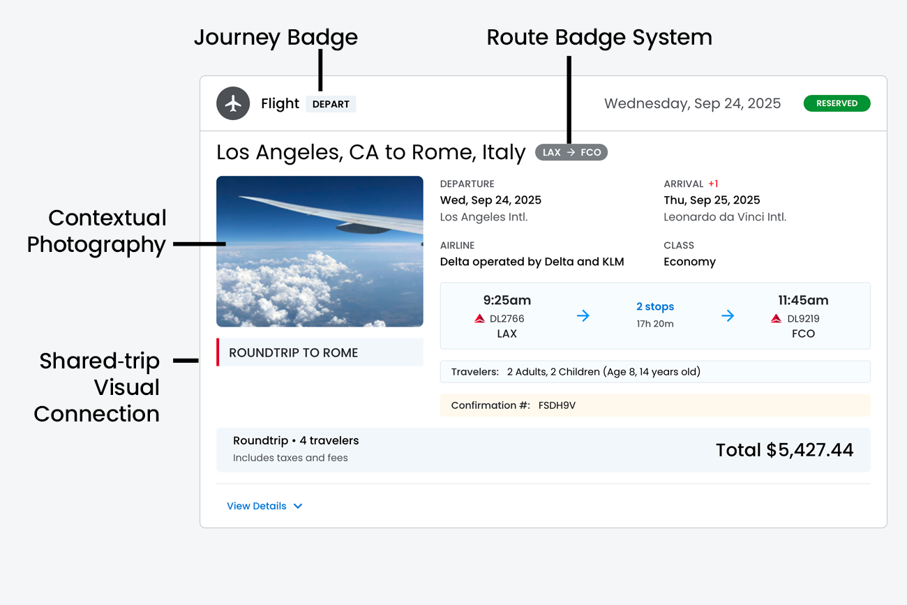 - Information Architecture ‐ Each card maintains complete flight details (times, airports, connections, traveler information) to function independently, while strategic visual cues preserve the logical relationship between segments.